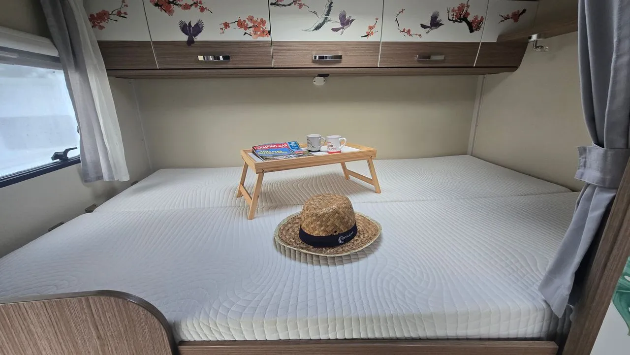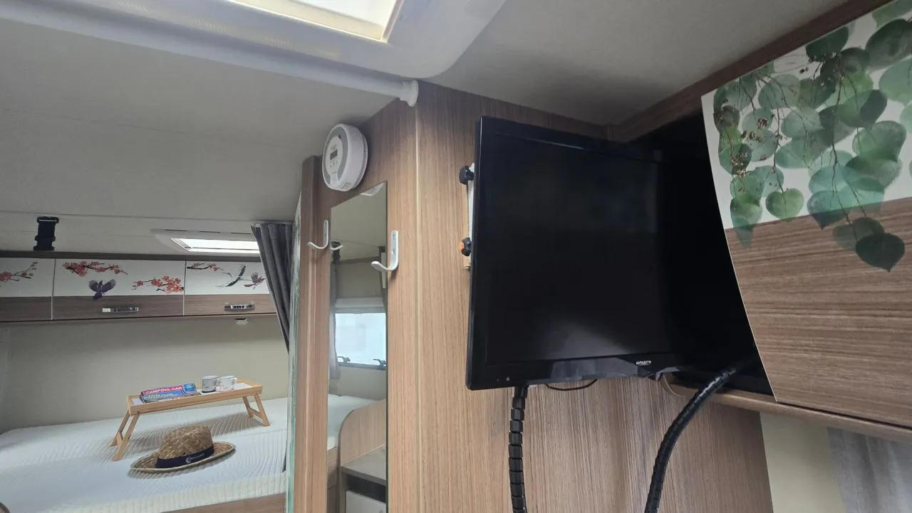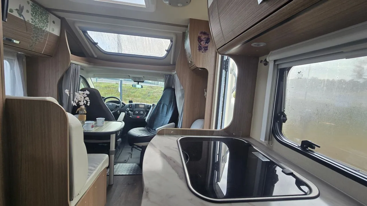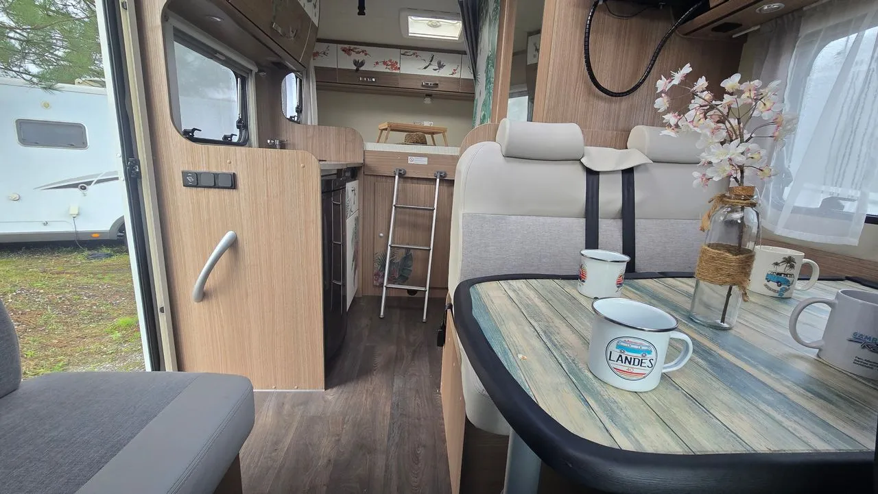 Il dispose d’un salon, d’une cuisine équipé avec réfrigérateur, d’un lit arrière ainsi que d’une grande soute.