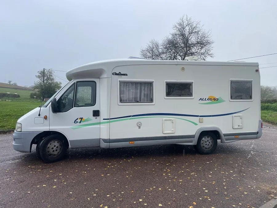 Joli camping-car profilé CHAUSSON Allegro 67 sur Fiat Ducato 2.8L, 5 places carte grise, moins de 7m, bien équipé (Porte 3 vélos, Store, Panneau solaire, caméra de recul…) avec lit à la française.