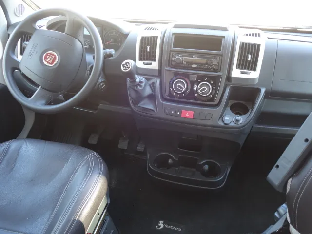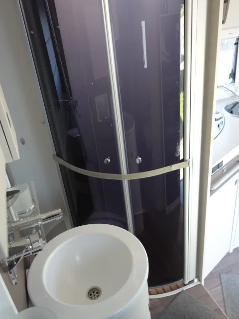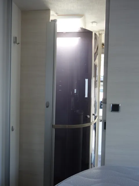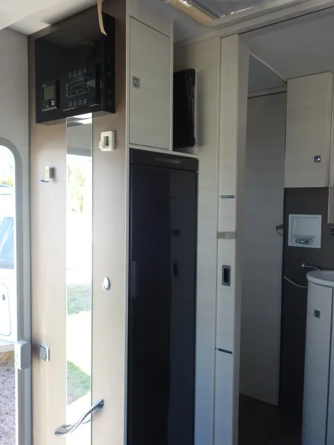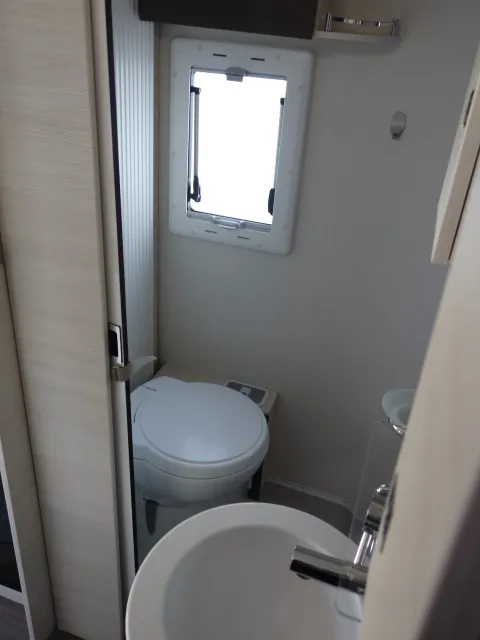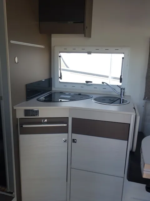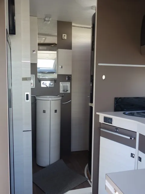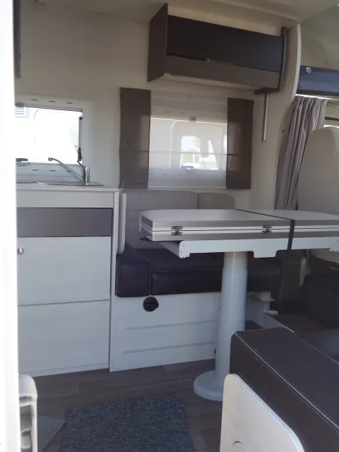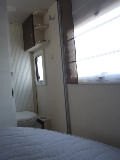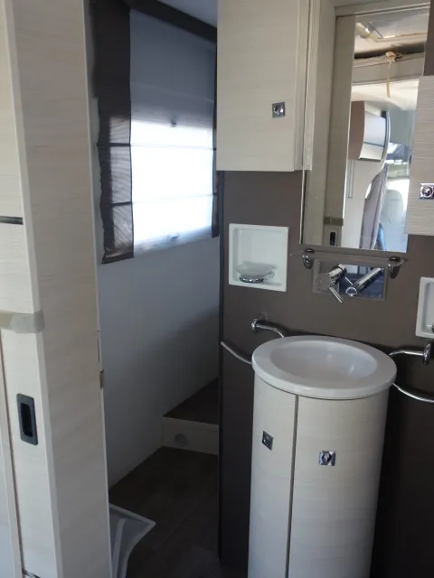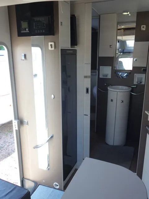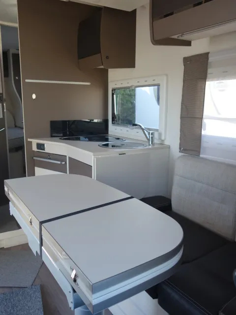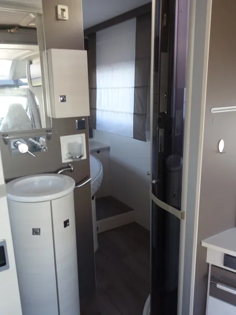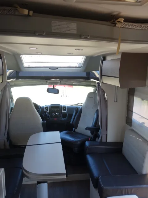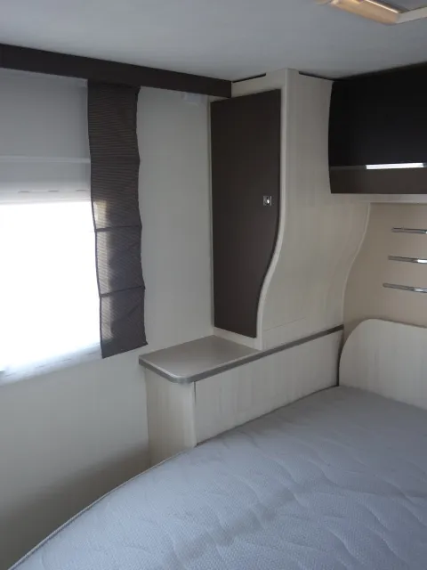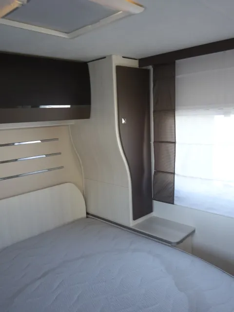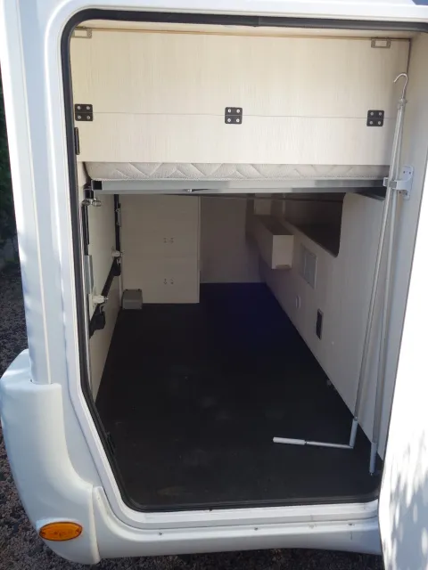Profilé avec lit central réglable en hauteur sur garage, cabinet de toilette avec lavabo douche et WC séparés, lit de pavillon, équipements: store, panneau solaire, antenne satellite automatique, TV, caméra de recul, auto radio, attelage, porte vélos télescopique, chauffage TRULA gasoil.