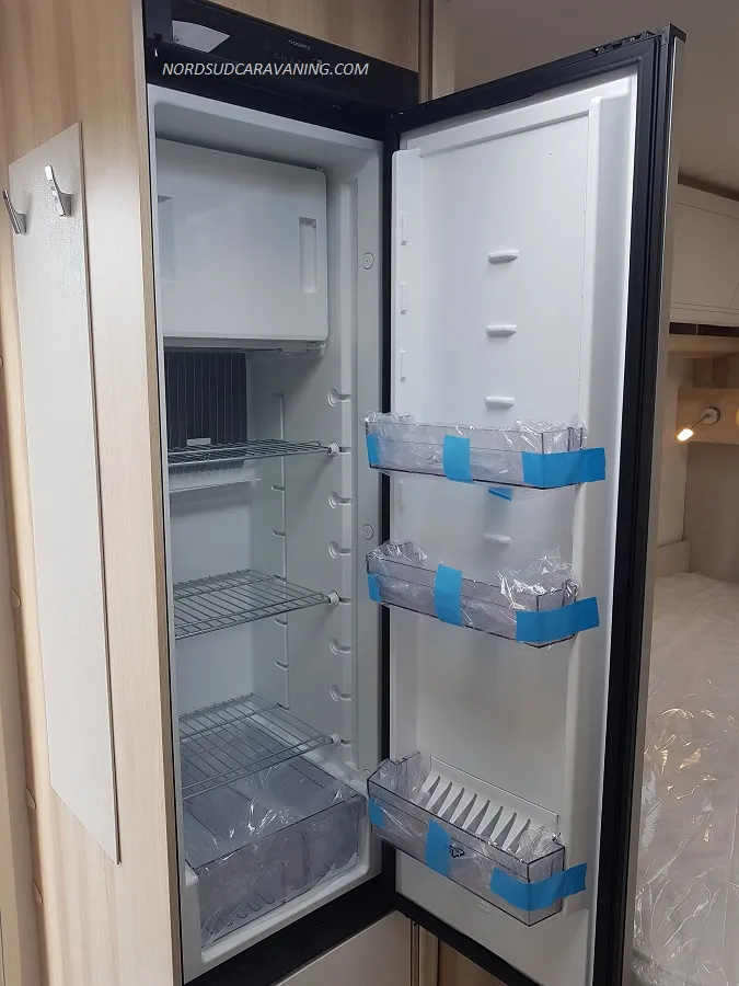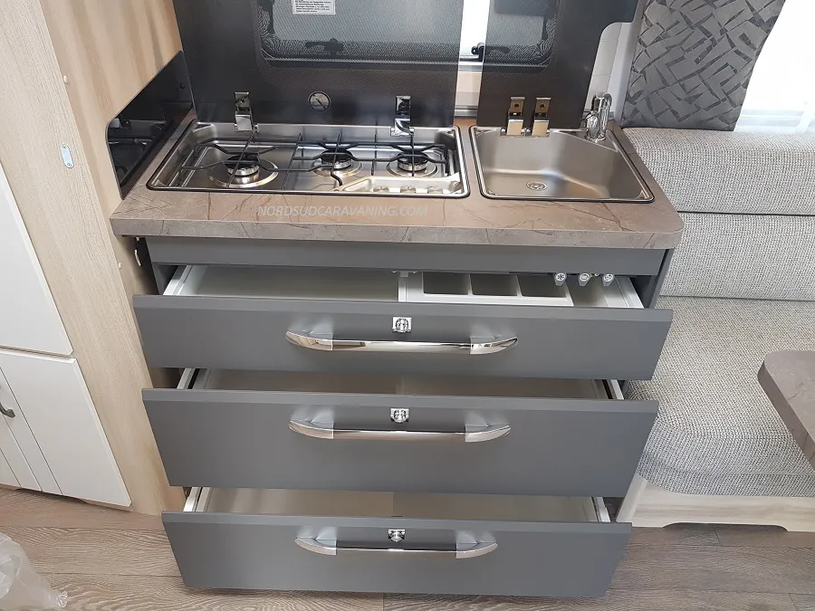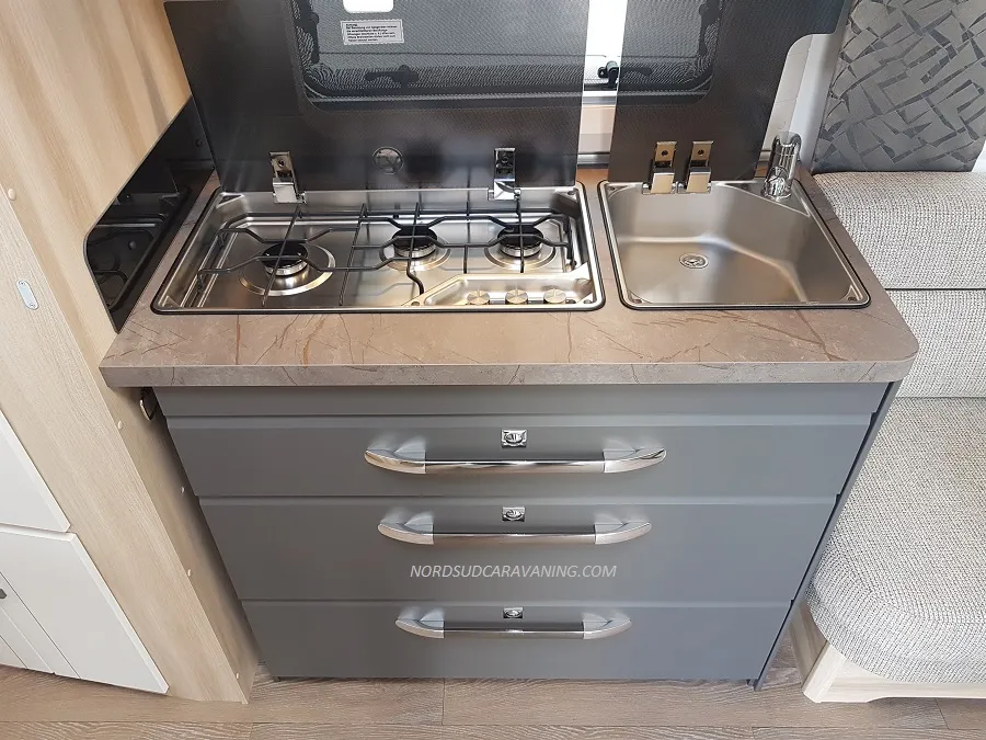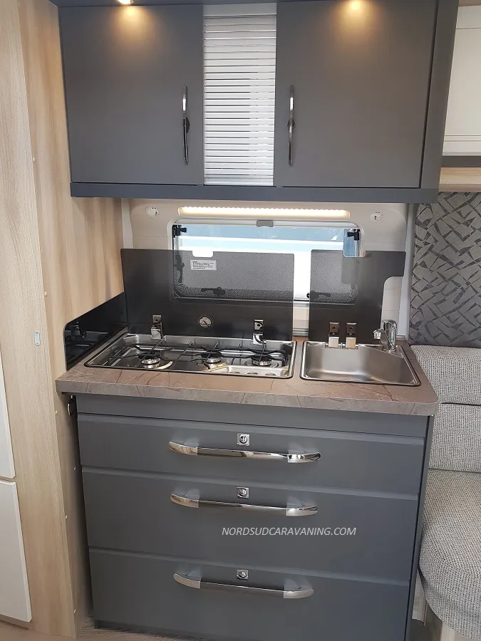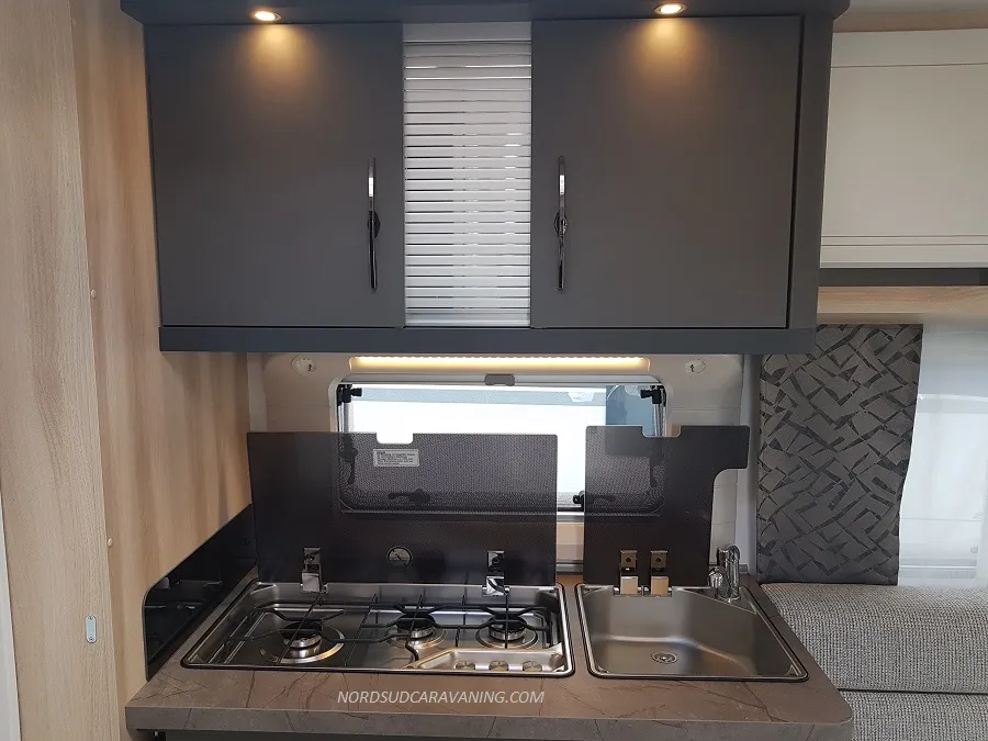 Pratique avec ses nombreux rangements, elle est très fonctionnelle avec sa cuisine équipée d’un réchaud 3 feux et évier inox protégés par un couvercle en verre et d’un réfrigérateur à absorption 133L.