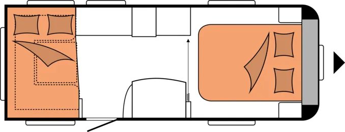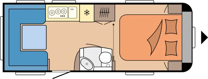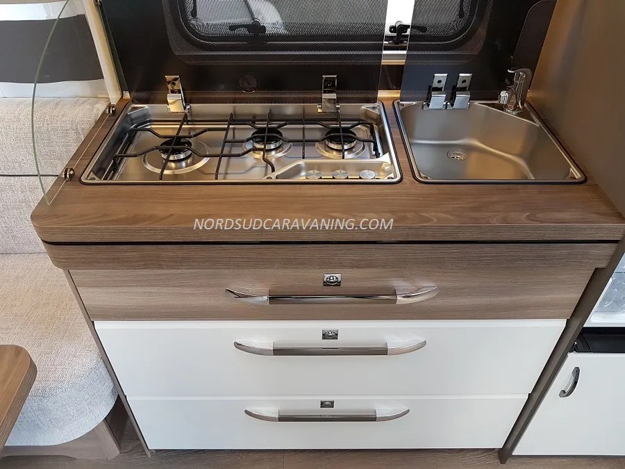 Cette superbe caravane est dotée d’un joli salon en U spacieux et convivial pour en profiter en couple, en famille ou entre amis. Il est transformable en couchage pour deux personnes. Son lit central vous permettra de profiter d’un espace de repos confortable facilement accessible des deux côtés et avec de multiples espaces de rangement. Sa cuisine équipée d’un réchaud 3 feux, d’un évier, d’un réfrigérateur congélateur avec double ouverture, qui ravira le cuisinier ou la cuisinière. Elle dispose également d’une salle de bain compacte, équipée d’un WC, d’un lavabo et d’un bac de propreté qui vous apportera un maximum de confort.