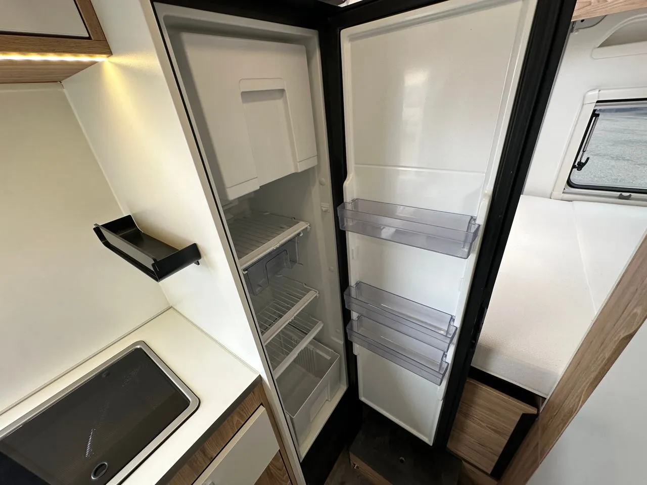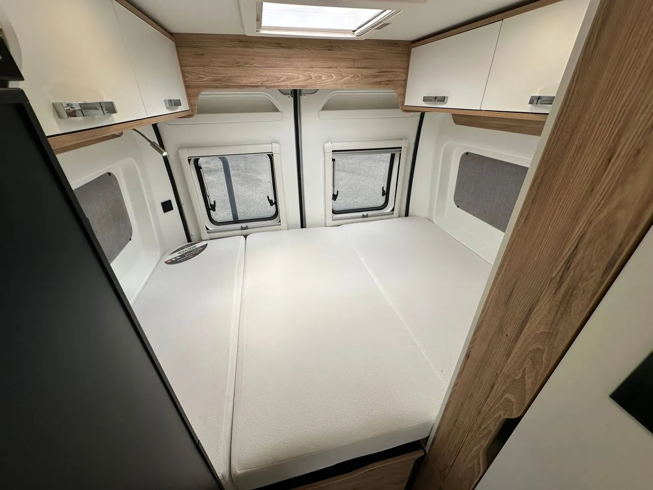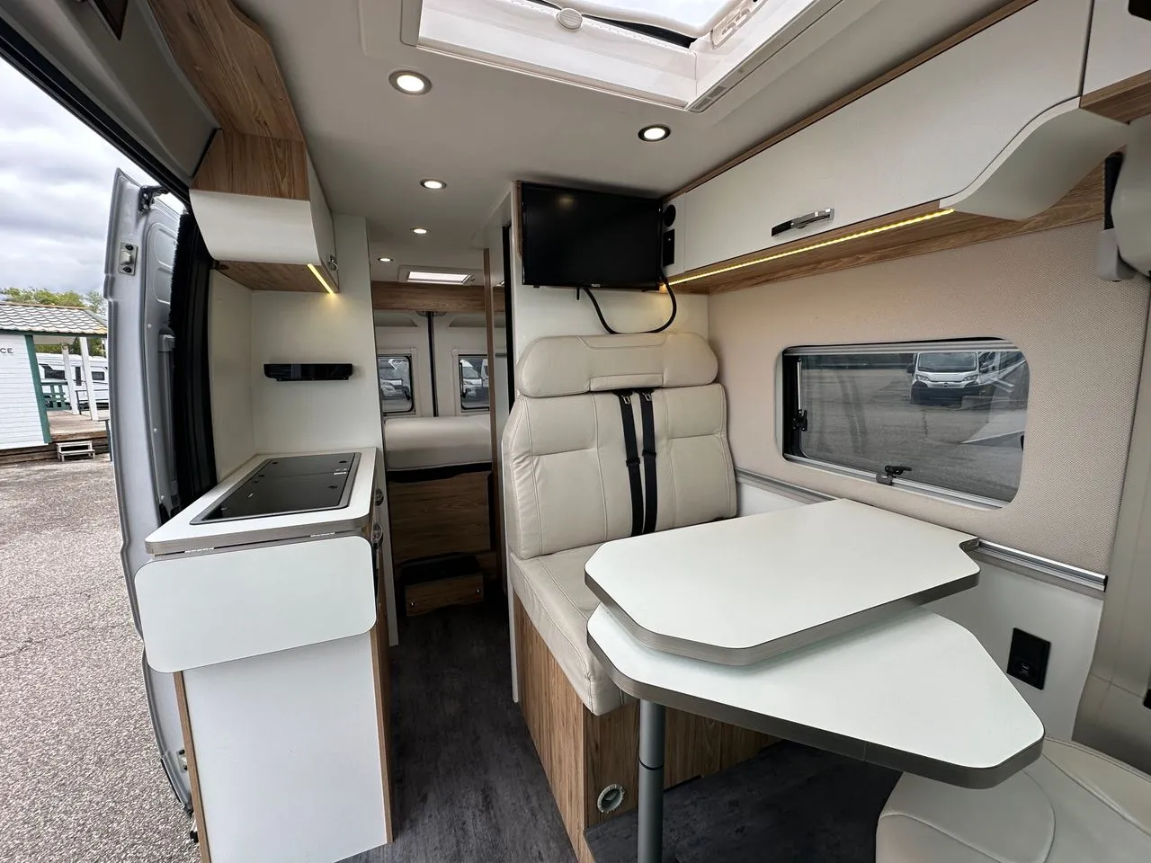 Lit transversal 6m avec lit dinette en option, grand frigo à compression, douche avec toilette coulissant et cuisine avec de nombreux tiroirs.