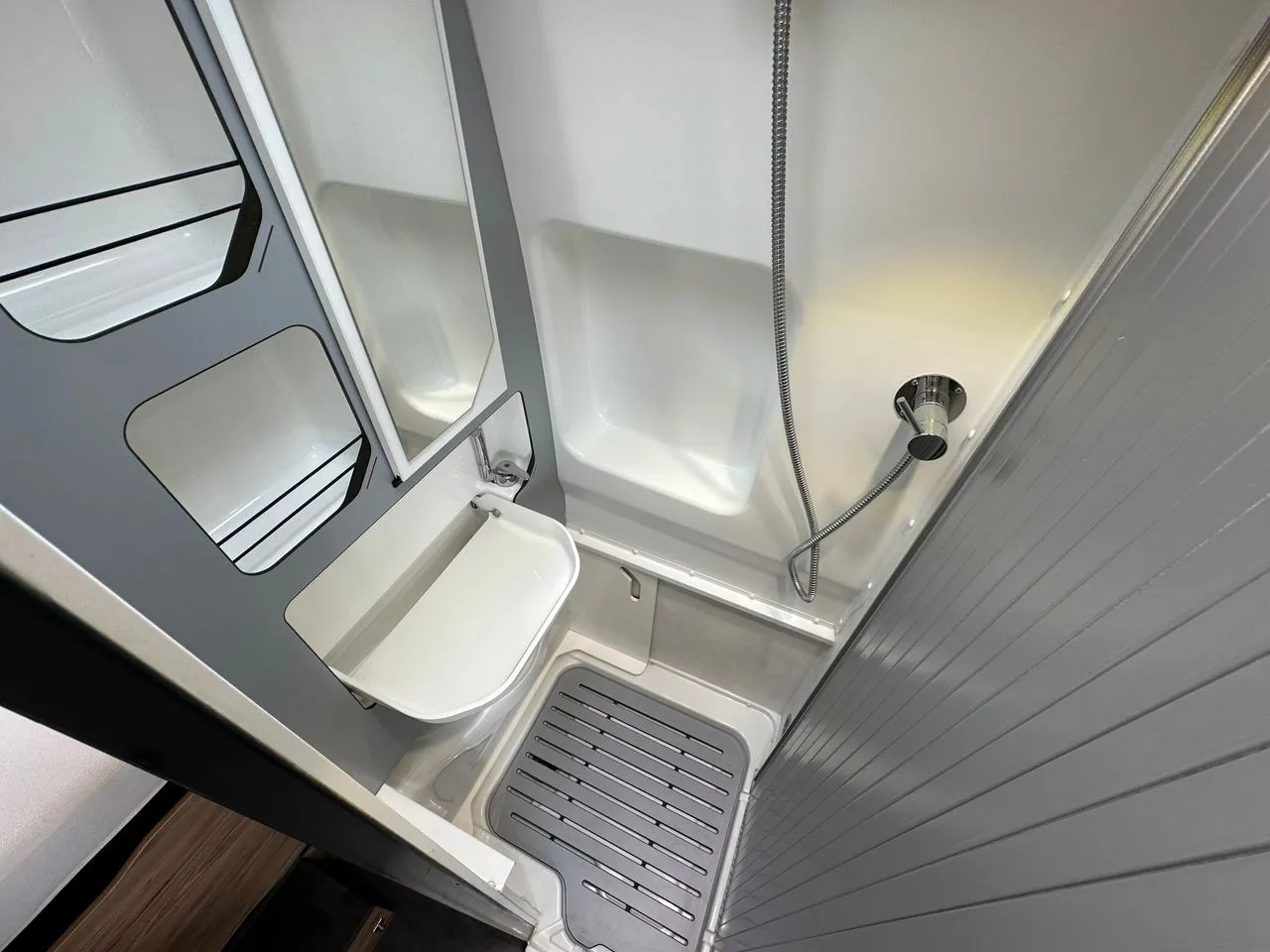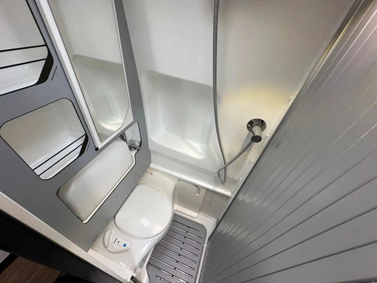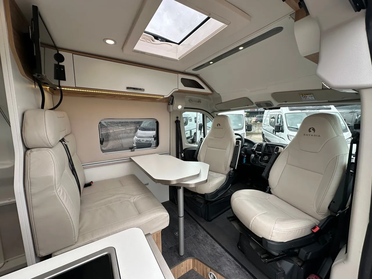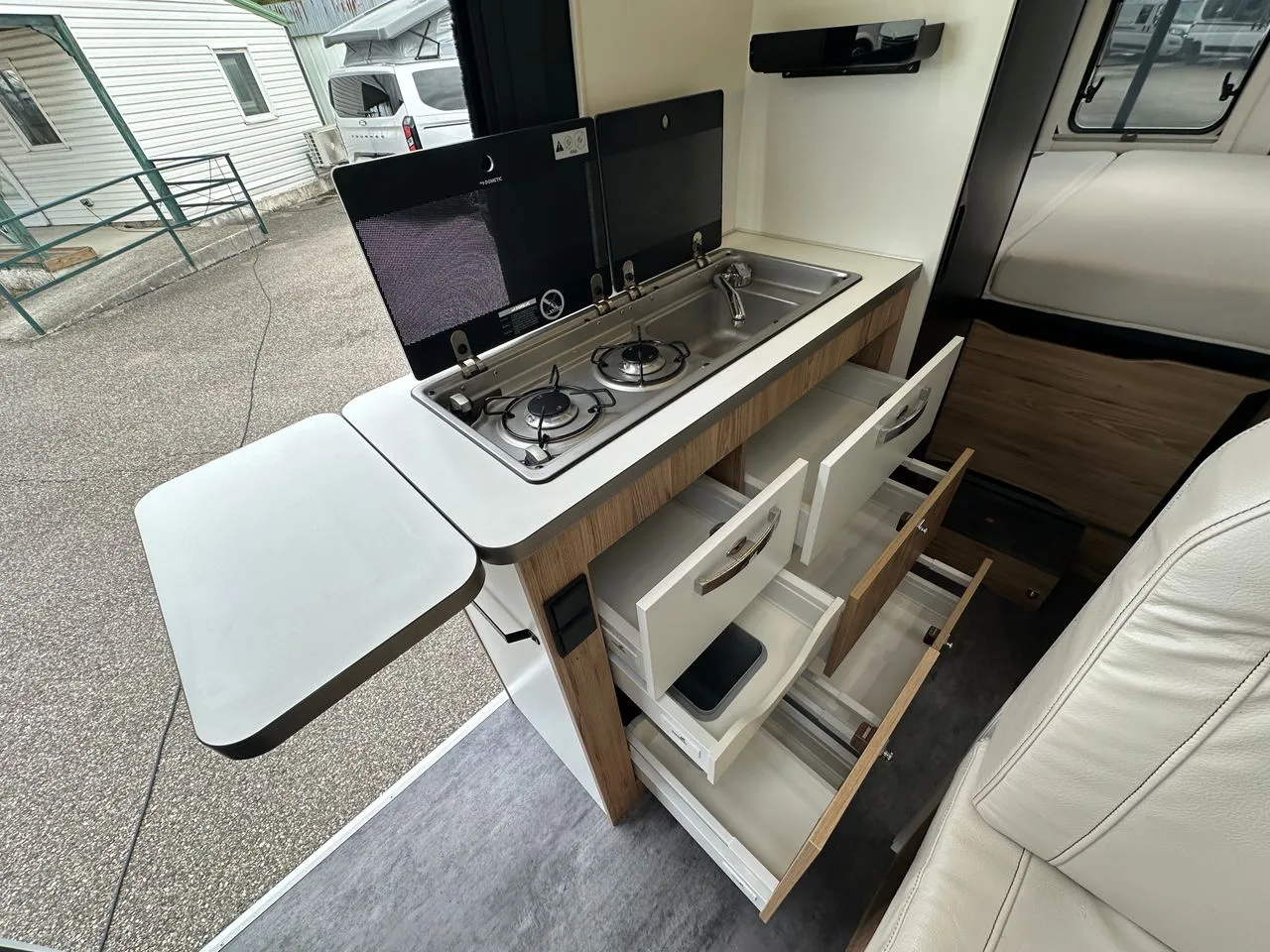 Lit transversal 6m avec lit dinette en option, grand frigo à compression, douche avec toilette coulissant et cuisine avec de nombreux tiroirs.