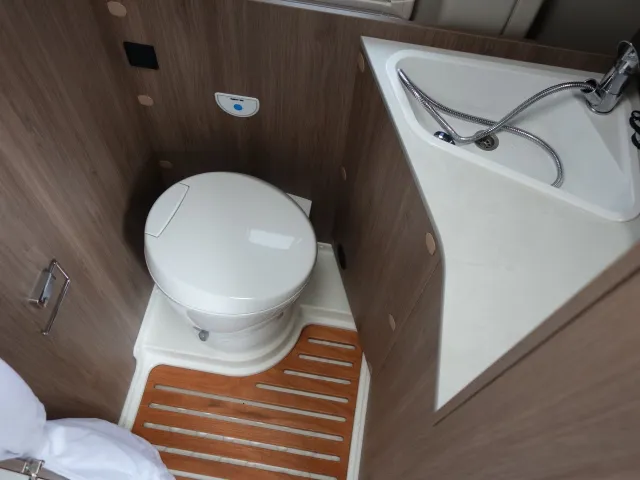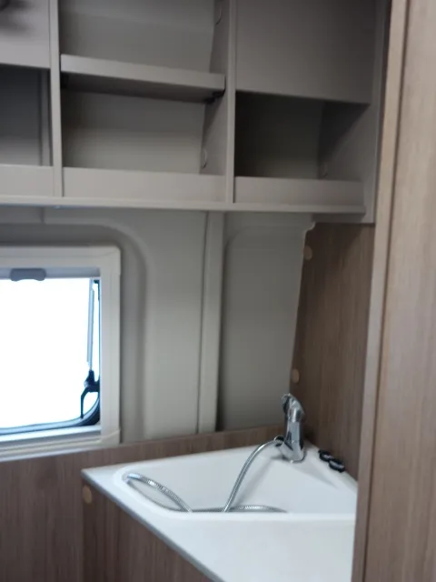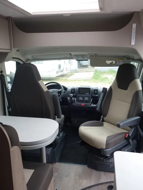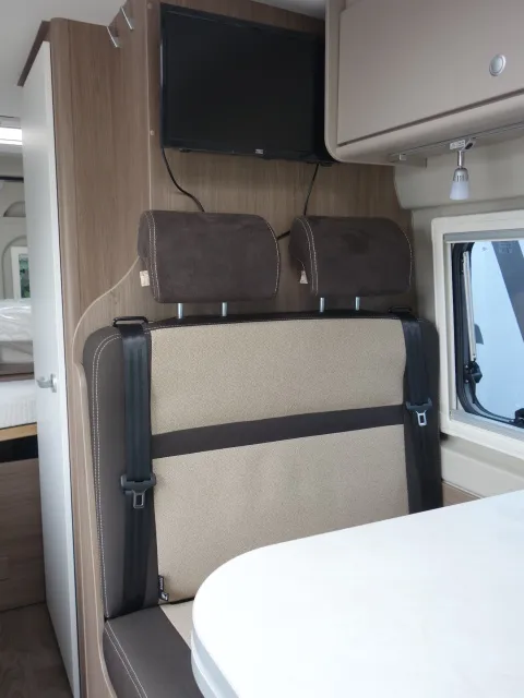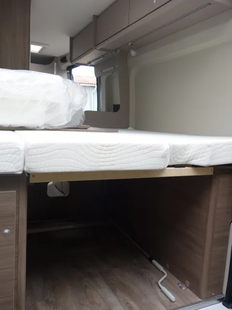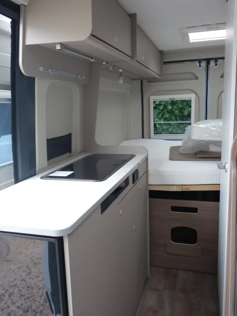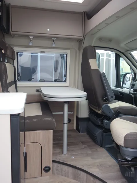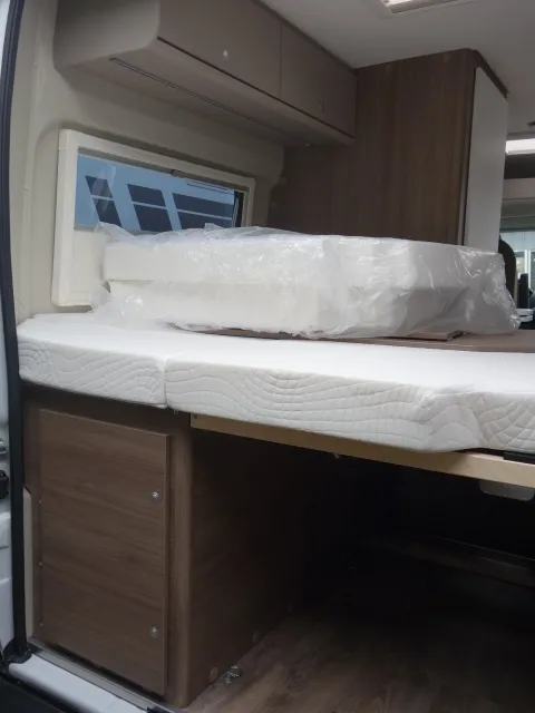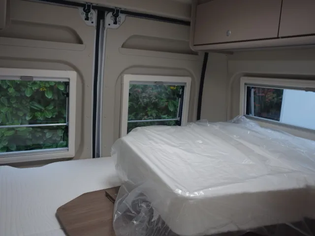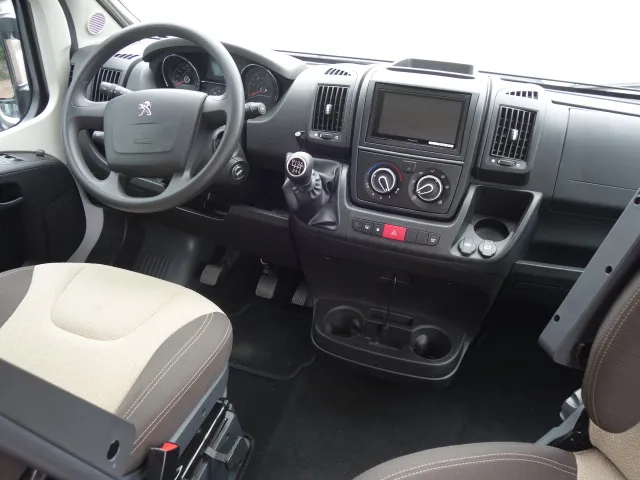 Fourgon grand lit arrière transversal, cabinet de toilette avec douche et WC , baie, dinette transformable en couchage, équipements; store, panneau solaire, auto radio, caméra de recul, attelage.