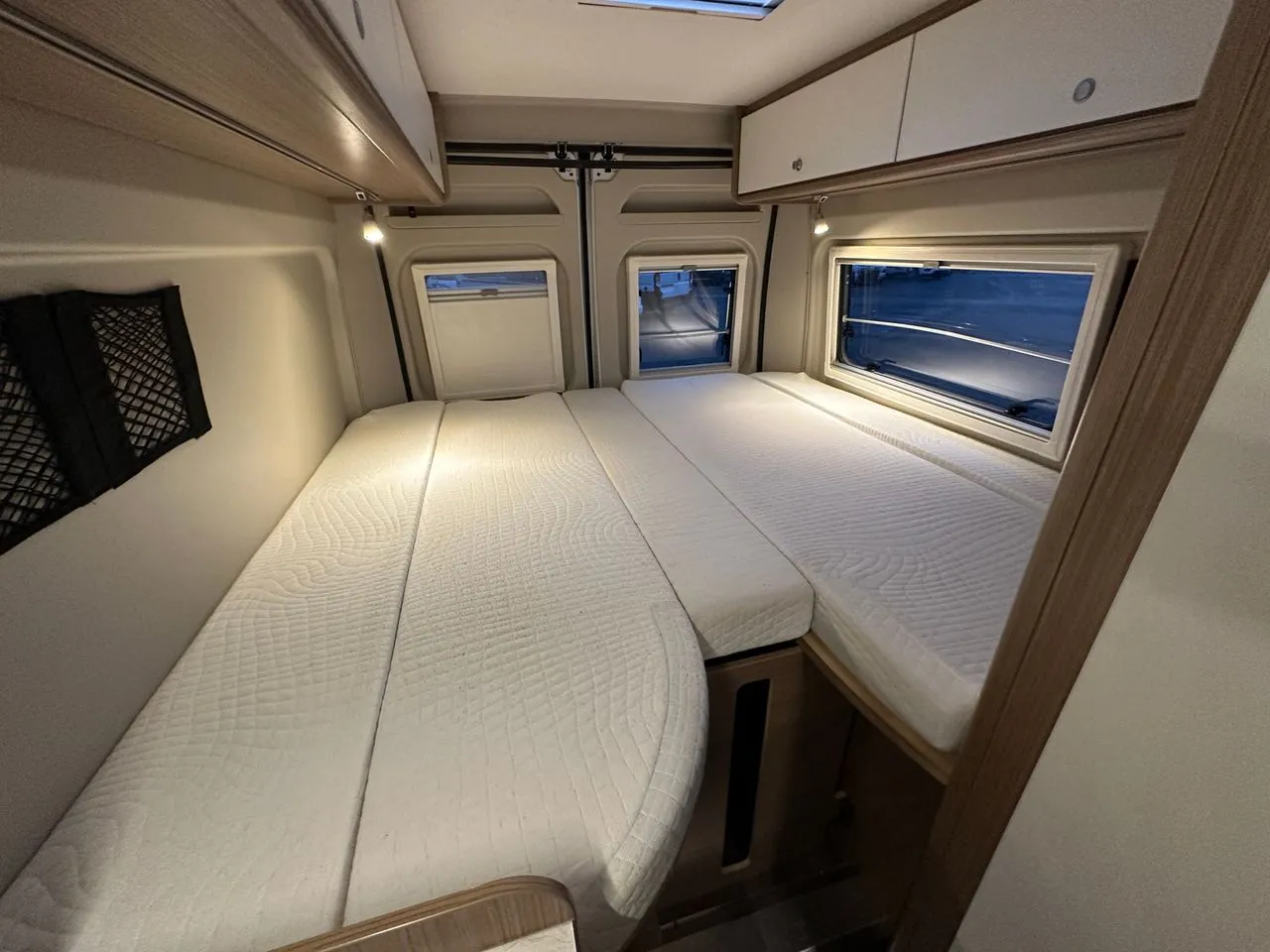 Fourgon tout confort avec grand lits jumeaux modulable.