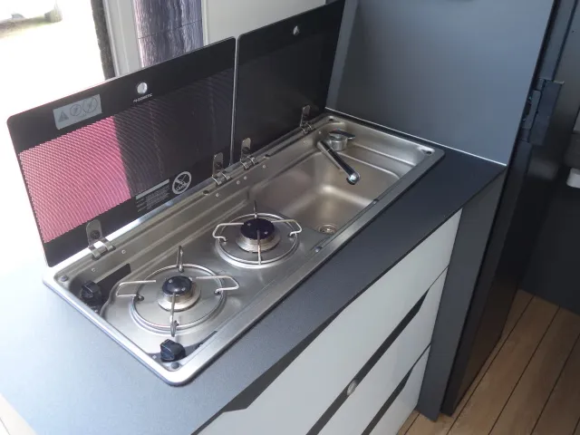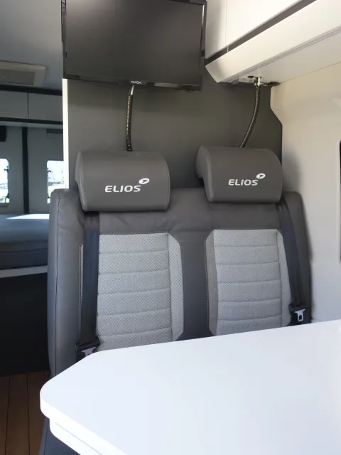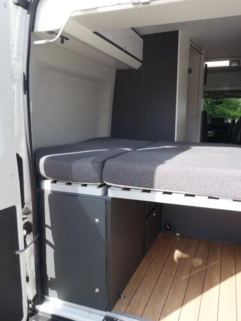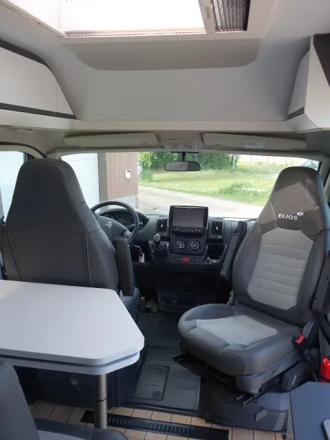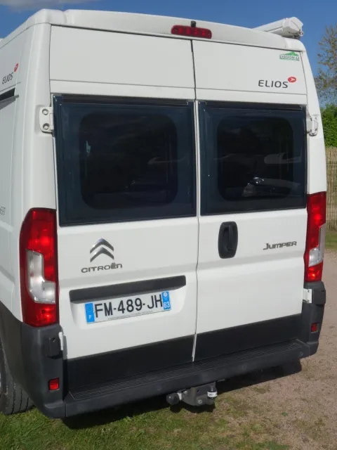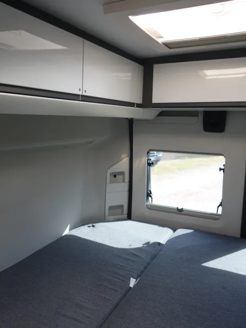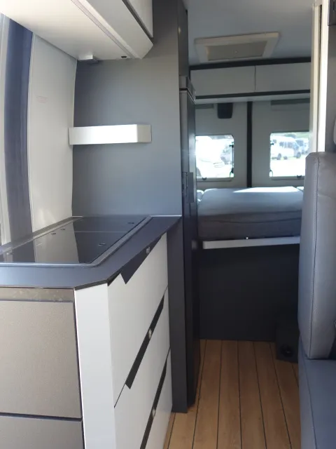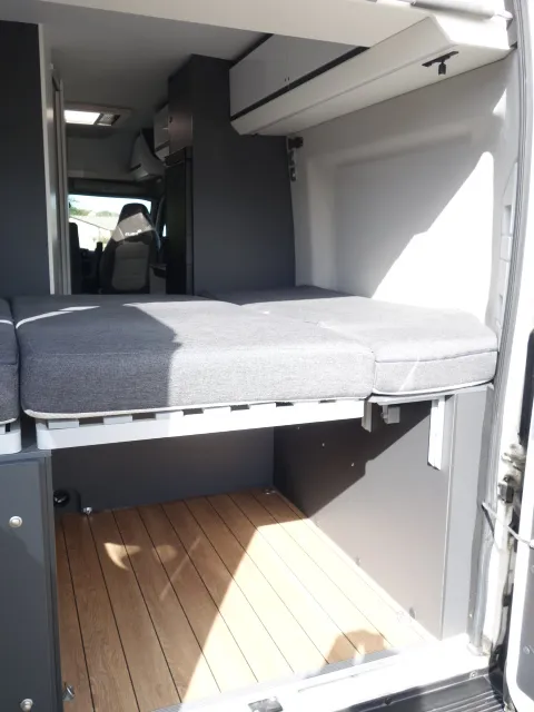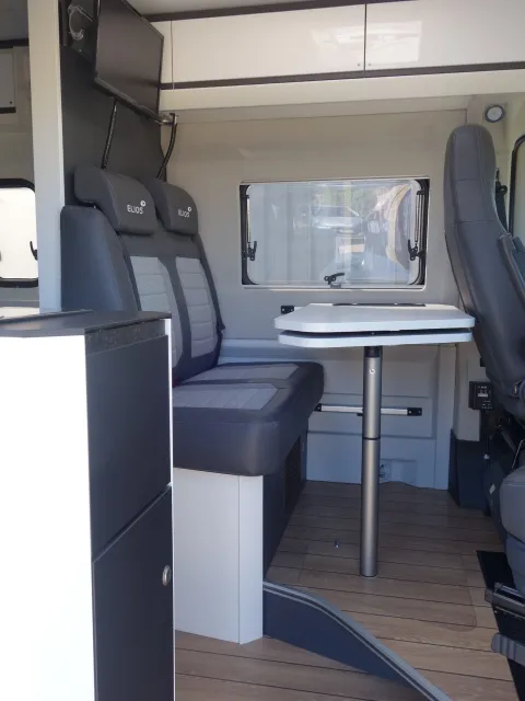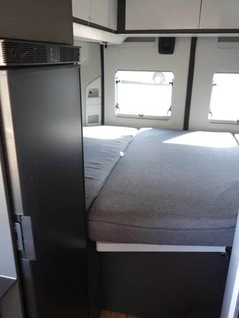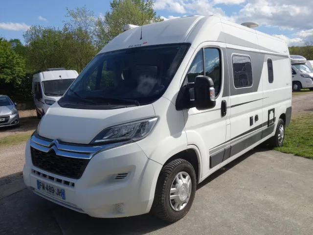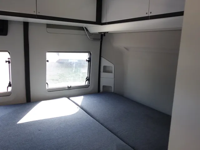 Fourgon avec grand lit AR transversal, cabinet de toilette avec WC et douche vario ( panneau amovible), grand réfrigérateur 130 l à compression, équipements : store, panneau solaire, auto radio, caméra de recul, stores plissés cabine, attelage, suspensions AR pneumatiques, antenne TV htz, TV.