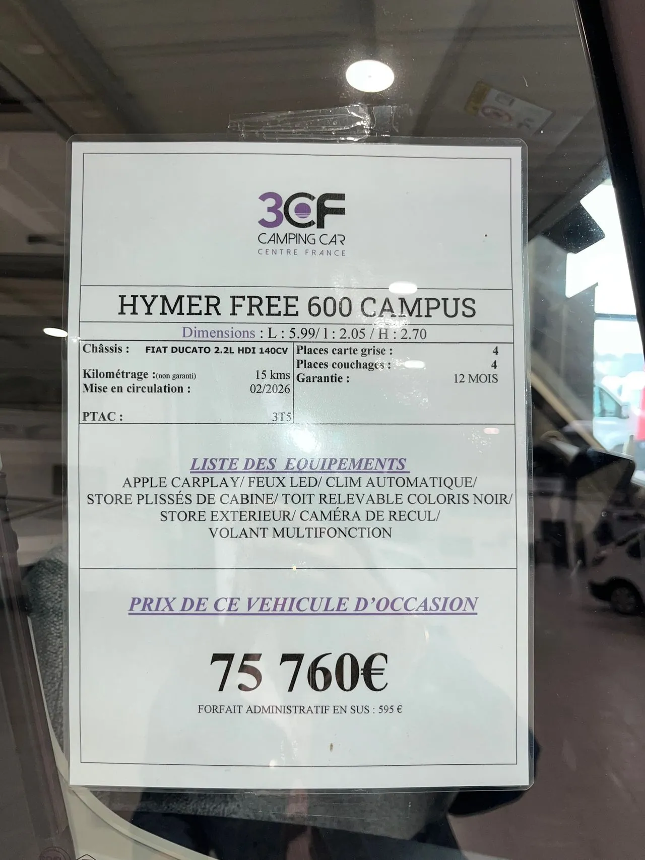 🚐 HYMER FREE 600 CAMPUS – FOURGON –DISPONIBLE IMMÉDIATEMENT CHEZ 3CF